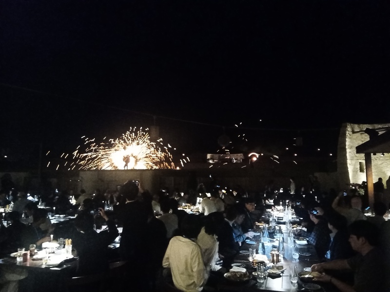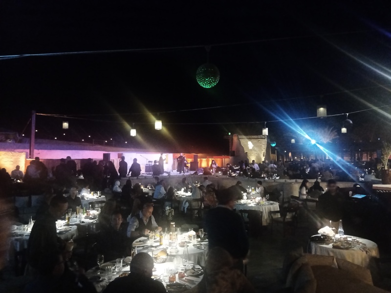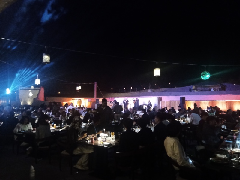懇親会会場.砂漠までバスで送ってもらって,ぞろぞろ,と.